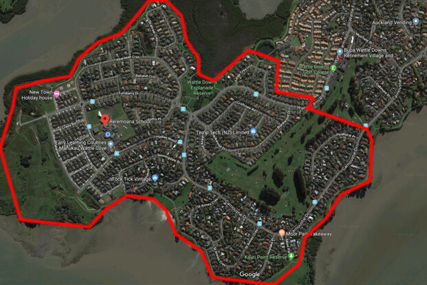 “All the area of the Wattle Downs Peninsula south/south west of a line that runs from the southern boundary of the Acacia Cove retirement complex in Wattle Farm Road, across the Wattle Downs Golf Course to the point at which it’s north eastern boundary meets Carnoustie Drive. The zone includes all houses in Fergy Crescent, and houses in Wattle Farm Road south of and including Nos 154 and 155, all houses in Blackwood Drive, all house in Pinehurst Place, and all houses in Carnoustie Drive, south of and including Nos 35 and 48."